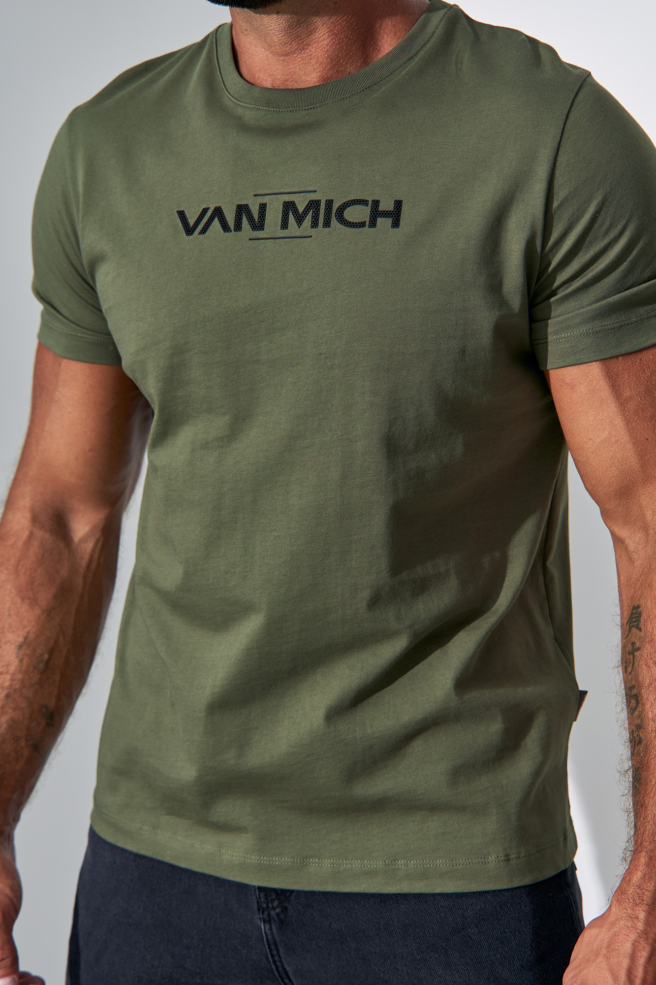 Откройте для себя совершенство минимализма с лаконичной футболкой цвета хаки от Van Mich. Эта футболка прямого силуэта, украшенная крупным фактурным логотипом на груди и небольшим логотипом вдоль горловины на спине, станет отличным выбором для ценителей строгих линий, качества и комфорта.